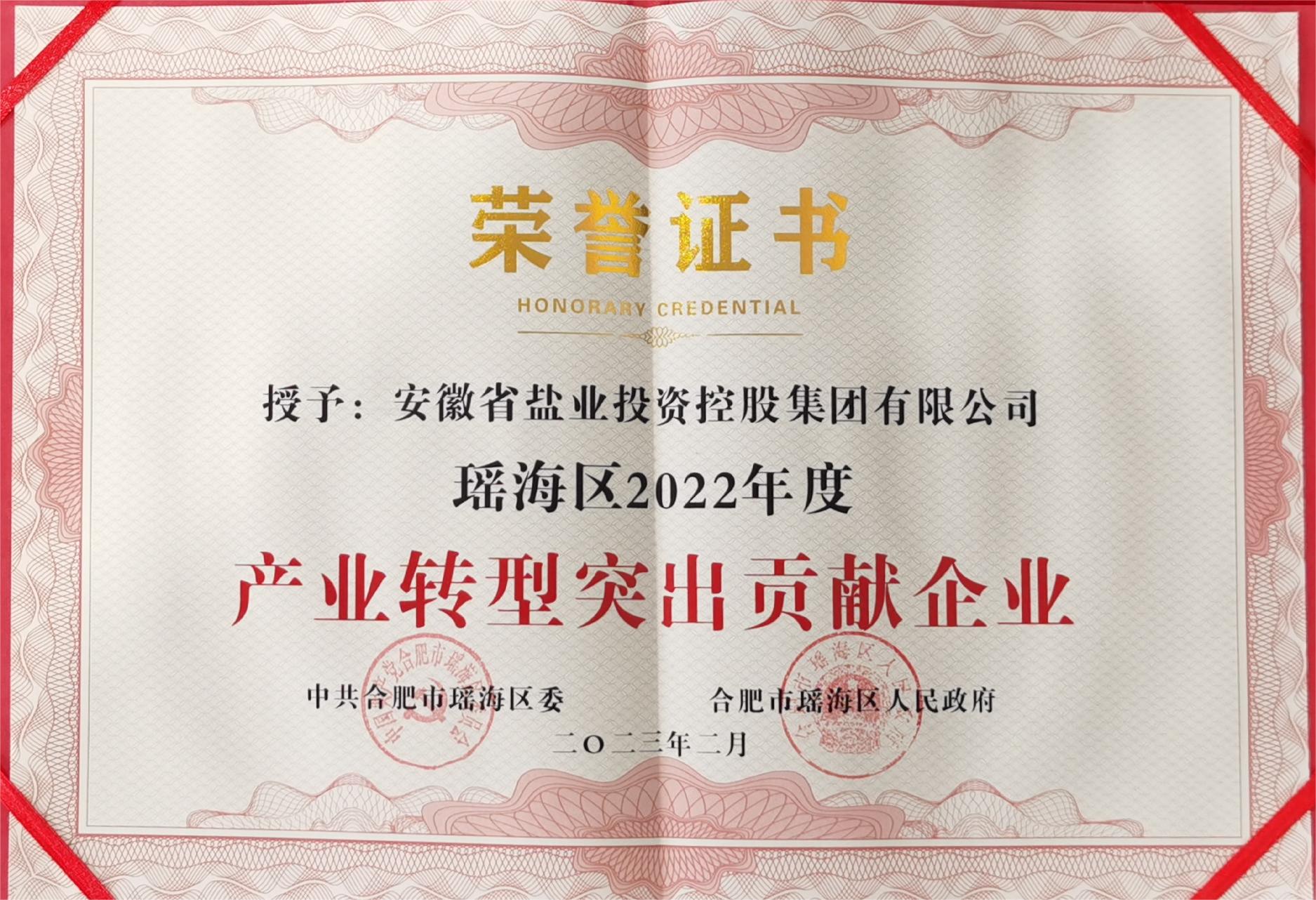 近日,省鹽業(yè)集團獲得瑤海區(qū)委、區(qū)政府授予的瑤海區(qū)2022年度“產(chǎn)業(yè)轉(zhuǎn)型突出貢獻企業(yè)”榮譽稱號。