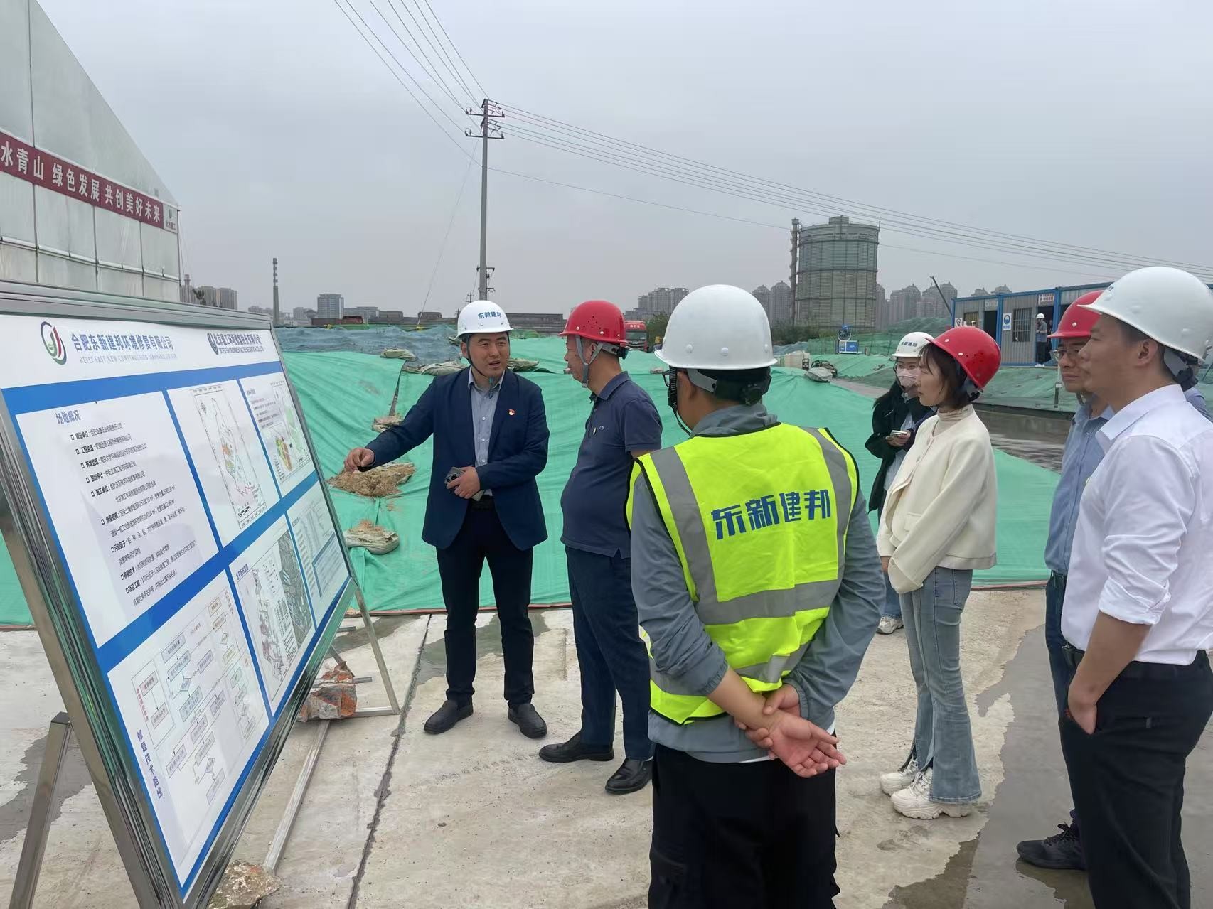 隨后,雙方深入到東新建邦環(huán)境修復(fù)公司承建的合肥造紙廠土壤修復(fù)項目現(xiàn)場。東新建邦環(huán)境修復(fù)公司副總經(jīng)理李泰平系統(tǒng)介紹了項目背景、修復(fù)技術(shù)方案、施工工藝以及目前推進(jìn)過程中重難點(diǎn)問題與解決方案等。雙方圍繞項目施工管理、質(zhì)量控制、安全保障等方面展開深度研討和經(jīng)驗分享。